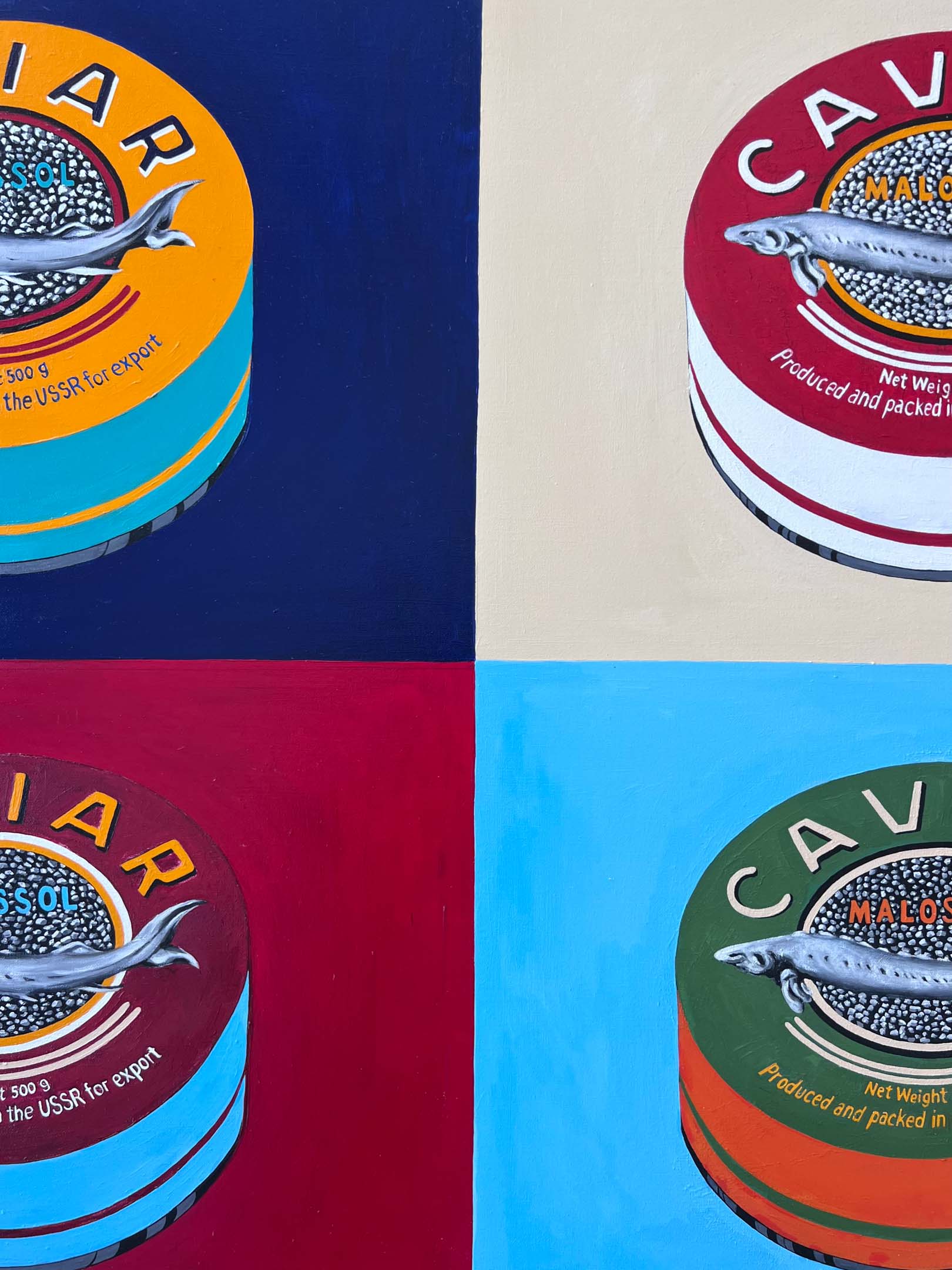 The Caviar series merges the nostalgia of Soviet heritage with the bold visual language of Western pop art, creating a dialogue between history and modernity. Each artwork transforms the iconic Malossol caviar tin into a meditation on desire, memory, and cultural identity.