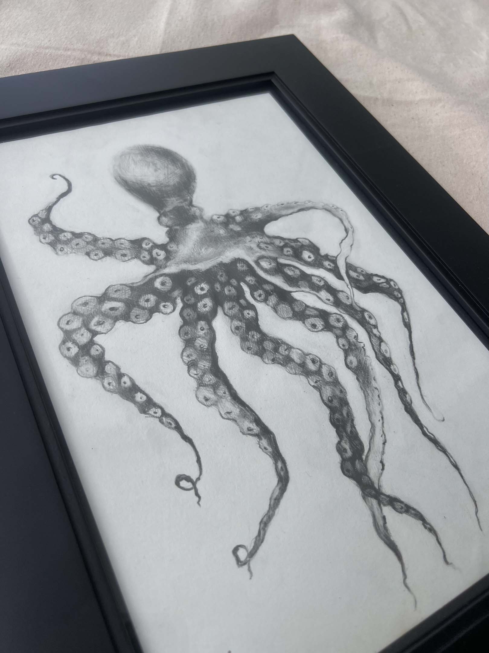 “Octopus” captures the fluid motion and intricate detail of this remarkable sea creature through expressive graphite shading and dynamic linework. The artist emphasizes the elegant sweep of its tentacles, the textured suction cups, and the soft, rounded form of its head, creating a sense of graceful underwater movement. Subtle contrasts and carefully blended tones bring life and depth to the drawing, inviting the viewer to appreciate the octopus’s unique beauty and captivating presence.