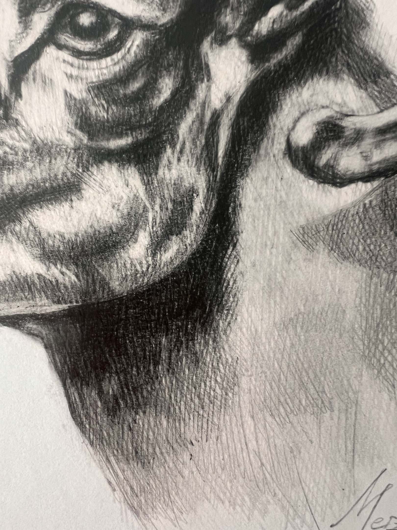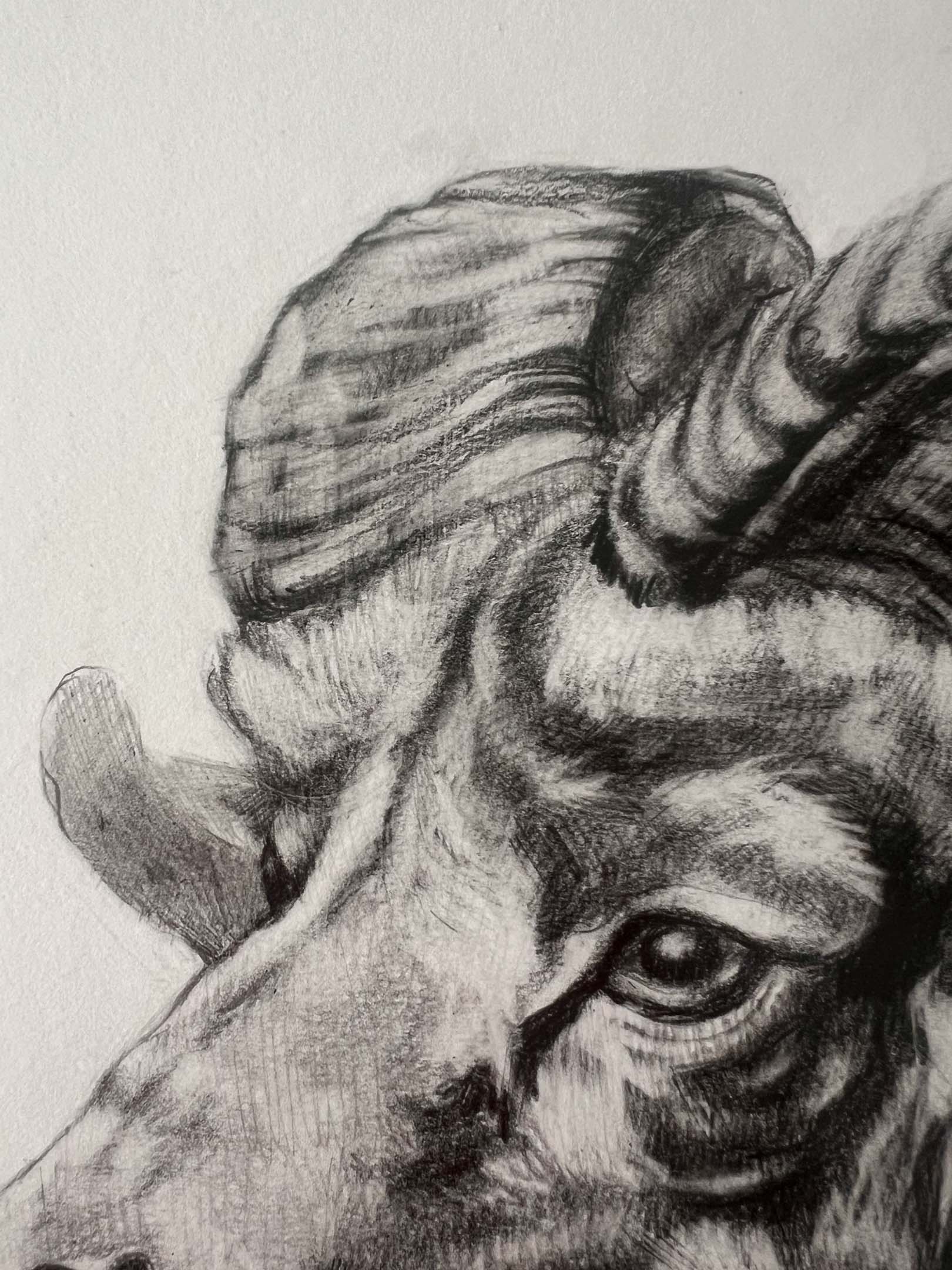 “RAM” presents a refined graphite study of a ram in profile, showcasing the elegant sweep of its horns and the strong contours of its face. The artist uses delicate shading and precise strokes to bring out the animal’s calm confidence and natural grace. Subtle textures and soft transitions create a lifelike presence, inviting the viewer to appreciate the quiet power and steady poise captured in this thoughtful portrait.